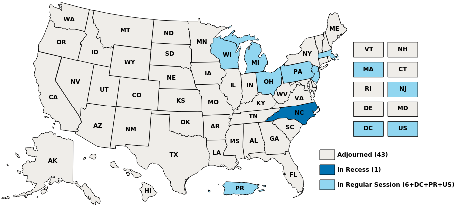 North Carolina passed an adjournment resolution that called for the regular session to recess and then reconvene monthly through April 2026. The legislature is next scheduled to meet on November 17. | | | | | | We are closely monitoring all legislative session activity to provide you with the most up-to-date information. (Got an on-the-ground tip on sessions? Email us!) | | | |